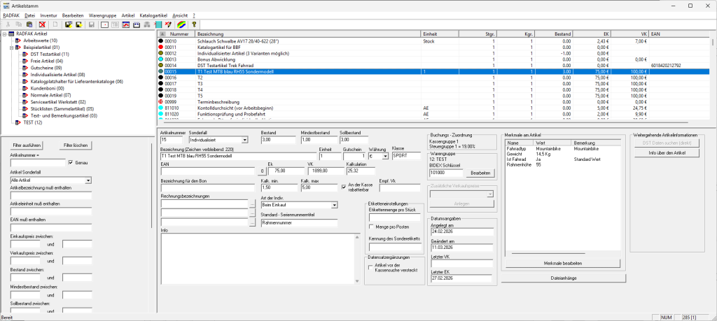 Der Artikelstamm ist ein mächtiges Werkzeug und bildet die Basis für die Arbeit mit der Kasse und den meisten RADFAK Funktionen. Die häufigsten Funktionen sind in einer einfach zugänglichen Menüleiste angeordnet, alle weiteren sind über Themenstrukturierte Menüs zu erreichen.