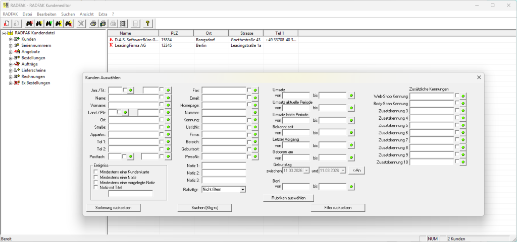 Es gibt fünf verschiedene Filter- und Suchoptionen im Kundeneditor von RADFAK. Hierüber kann nach so ziemlich jedem denkbaren attributmuster der Kundendaten gesucht werden.