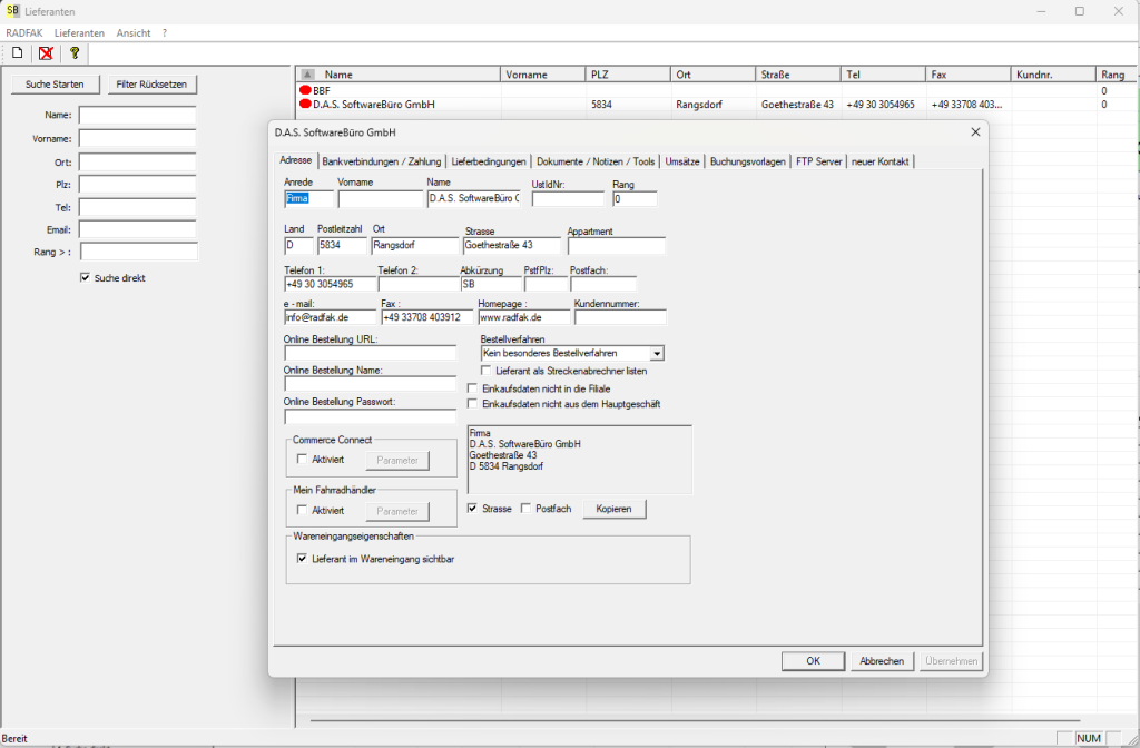 Das Radfak Lieferantenmodul beinhaltet alle lieferantenspezifischen Daten und Systemeinstellungen zu diesen. Angefangen über die Adressverwaltung, Kundennummern und Bestellverfahren (Veloconnect und weitere Standards) inklusive Zugangsdaten, die Bankverbindungsdaten für bis zu drei verschiedene Bankkonten, die Lieferbedingungen um im Wareneingang schnell zu sehen ob zum Beispiel die Frachtfreigrenze erreicht ist, eine allgemeine Notizfunktion zum Lieferanten, eine Übersicht der Lieferstatistik und der Lieferantenumsätze, die Buchungsvorlagen für die Konten des Wareneingangsbuches und eine Subkontaktverwaltung um Serviceabteilungen, den Aussendienst oder weitere Unterkontakte des Lieferanten verwalten zu können.