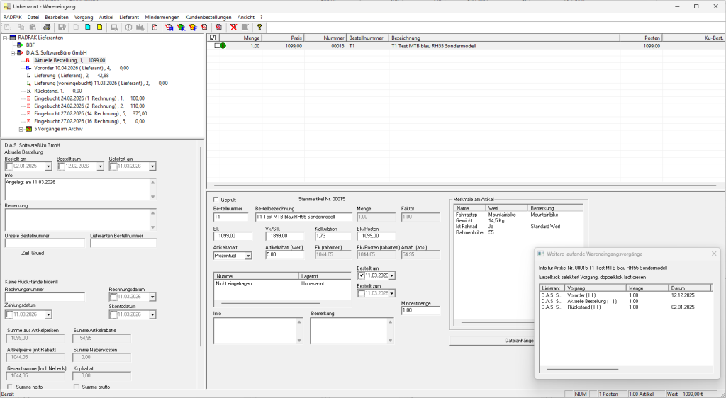 Sobald die Ware eintrifft, überprüfen Sie, ob alles was Sie bestellt haben, geliefert wurde. Denn mit RADFAK können Sie solche Vorgänge immer nachvollziehen. Sie suchen sich aus der Liste offener Lieferungen diejenige aus, die bearbeitet werden soll und bekommen die wichtigsten Daten der Lieferung auf den Bildschirm. Jetzt haben Sie alles, was Sie wissen wollen direkt im Blick. Wenn sich die Preise geändert haben, so ist dies für RADFAK kein Problem. Schnell und einfach lässt sich der Preis verändern und das bei gleichzeitiger Überwachung des Kalkulationsfaktors.